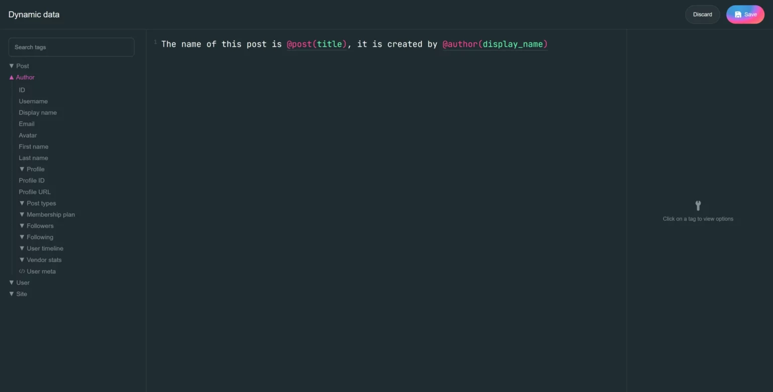 When designing a template, the relevant dynamic tags are made available based on context. For example, when you design a Post template, you get access to dynamic tags related to that Post type, Author, User, and Site.
