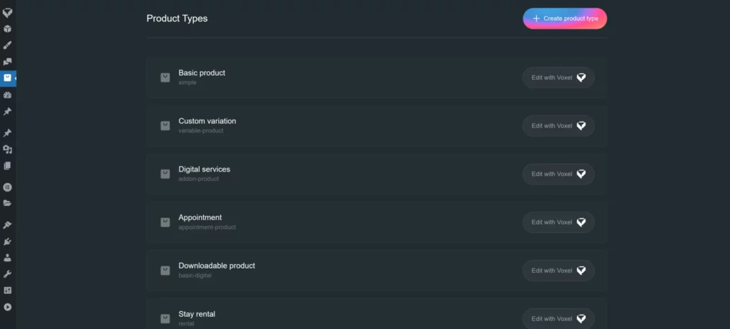 Product types define the configuration of a certain type of product that is sold on your site. They can be assigned to a Voxel managed CPT (Custom Post Type)