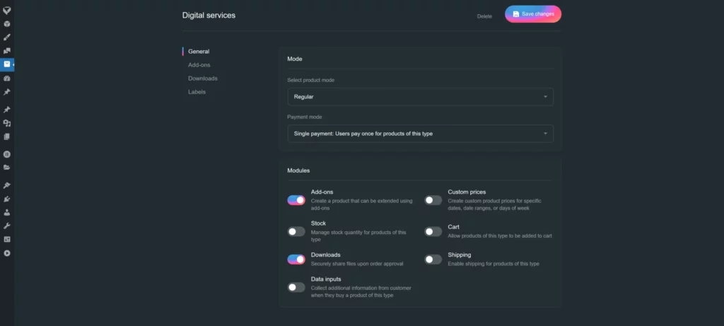 Different modules are available depending on the selected product mode and payment mode. Modules extend the product type with additional functionality such as Stock, Downloads, Add-ons, Shipping and others. We’ll cover all of these in upcoming articles