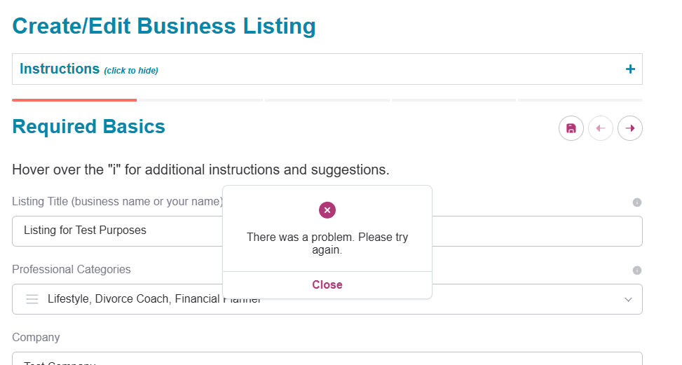 Clients with existing listings, and those trying to create new ones are receiving an error message: “there was a problem please try again” when trying to save.