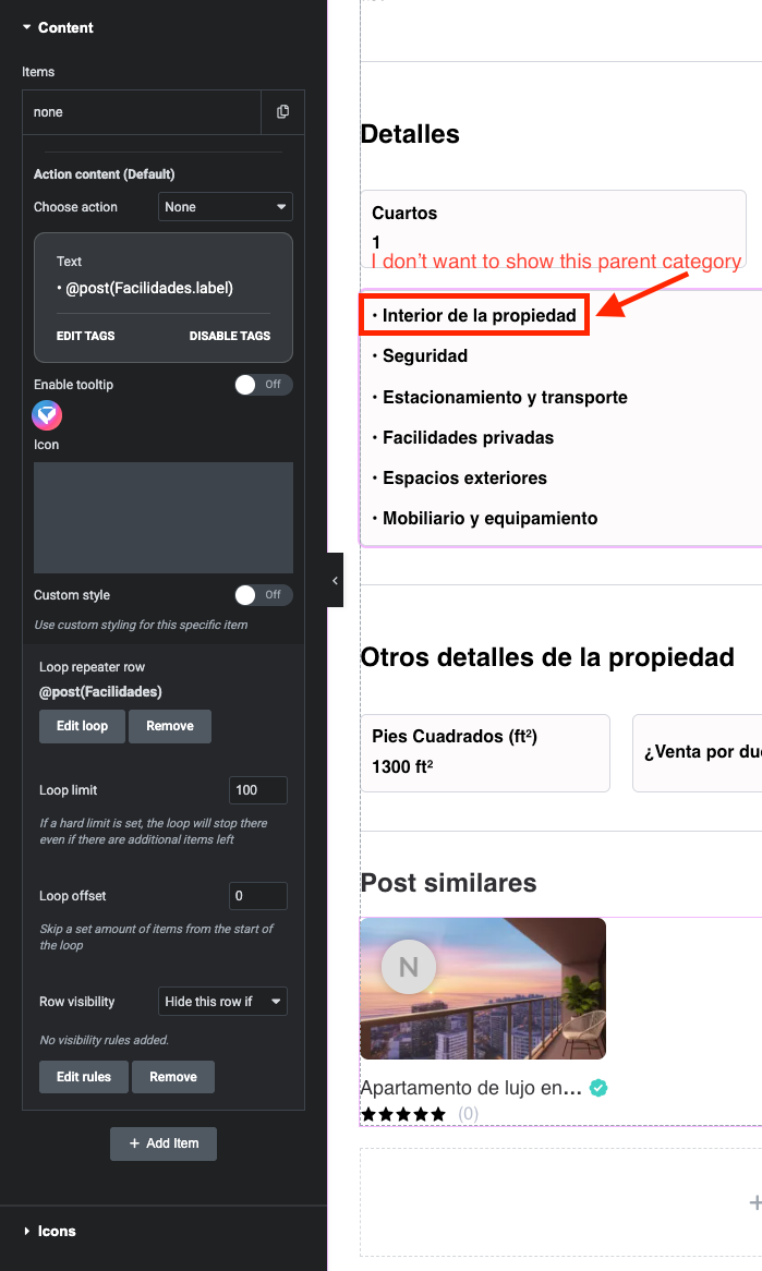 In my single listing template, I’m looping through a taxonomy field (Facilities). The loop is currently showing both the parent term and its child terms.
