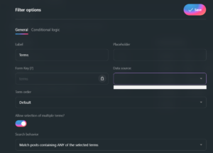 I am trying to setup some Taxonomies filters for my Therapist search page. I am using the Terms filter option, and when I click on Data Source, nothing shows up.
