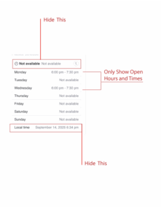 Is there a way to ONLY display the open hours of a listing instead of ALL the days with the wording “not available.” Also can I hide the “open now/ not available” action on top of time table and hide the “current time” on the bottom? *see attached example. If not, can I at least change the wording of the hours table?